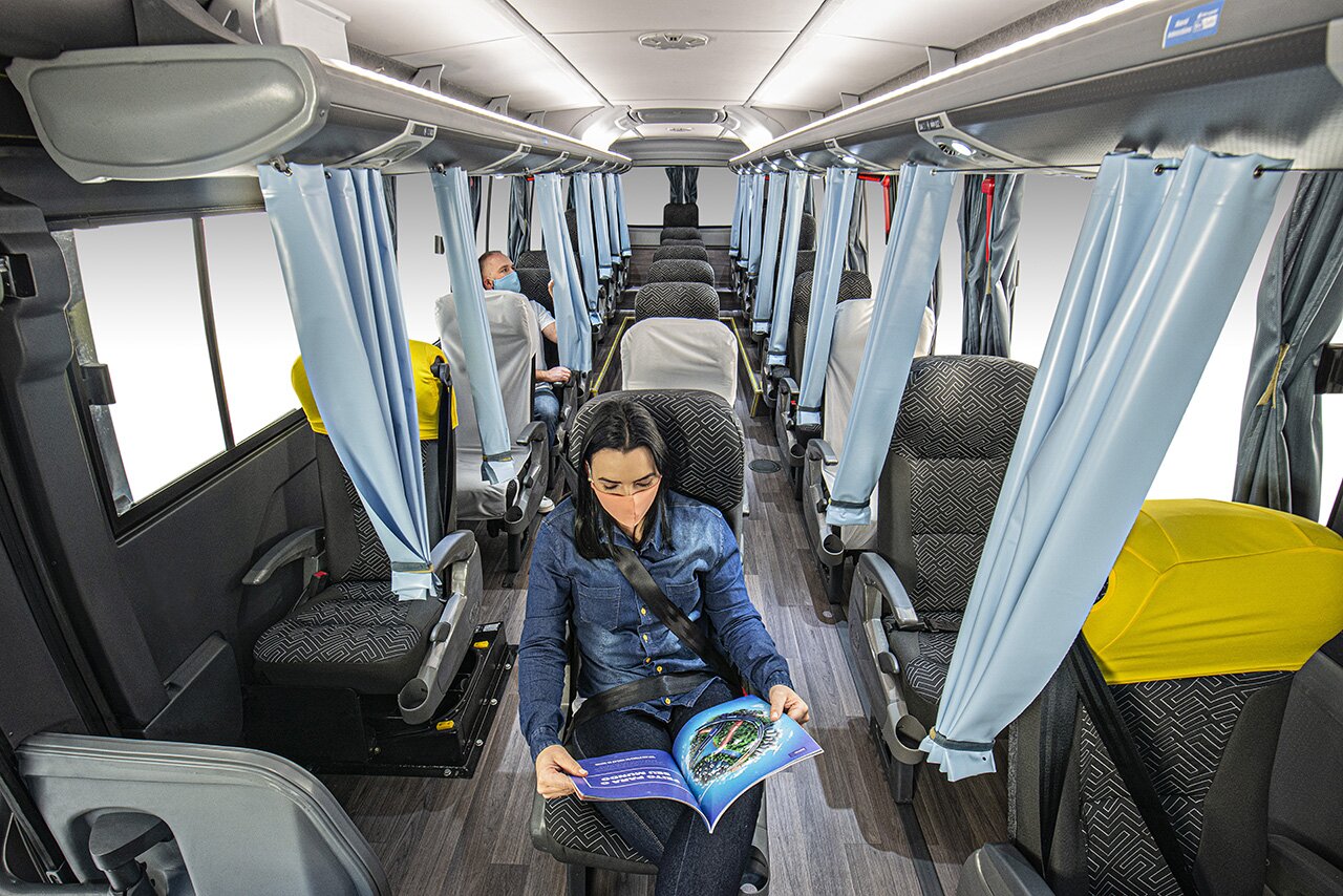 O Sistema Safe Distance permite que o distanciamento social seja respeitado dentro do transporte, separando os corredores convencionais em dois e aumentando a separação entre as poltronas, garantindo assim uma viagem ainda mais segura.
