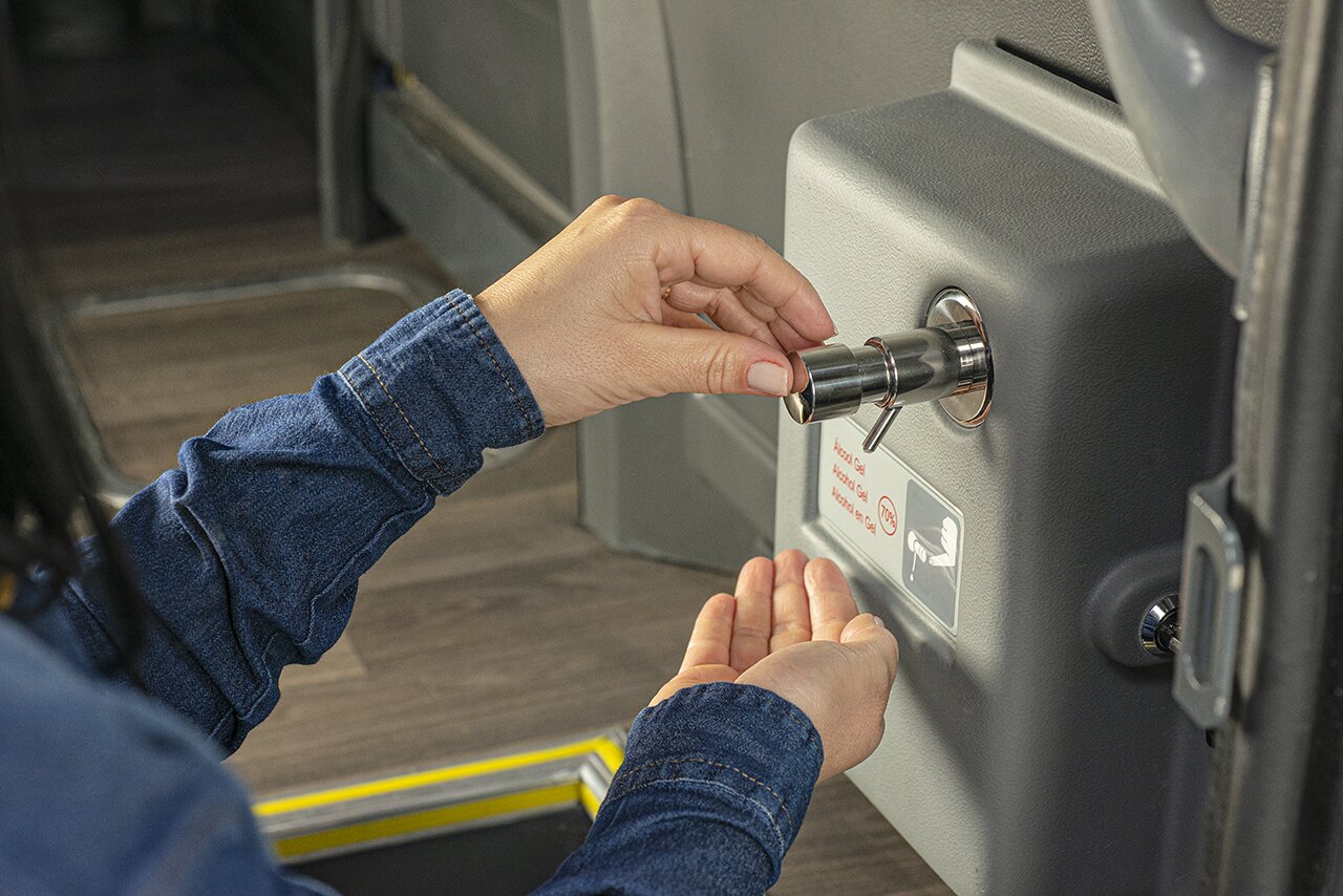 Localizado na entrada do transporte, o Dispenser é automático, possibilitado a higienização das mãos de forma segura, rápida e fácil, antes e depois de cada viagem.