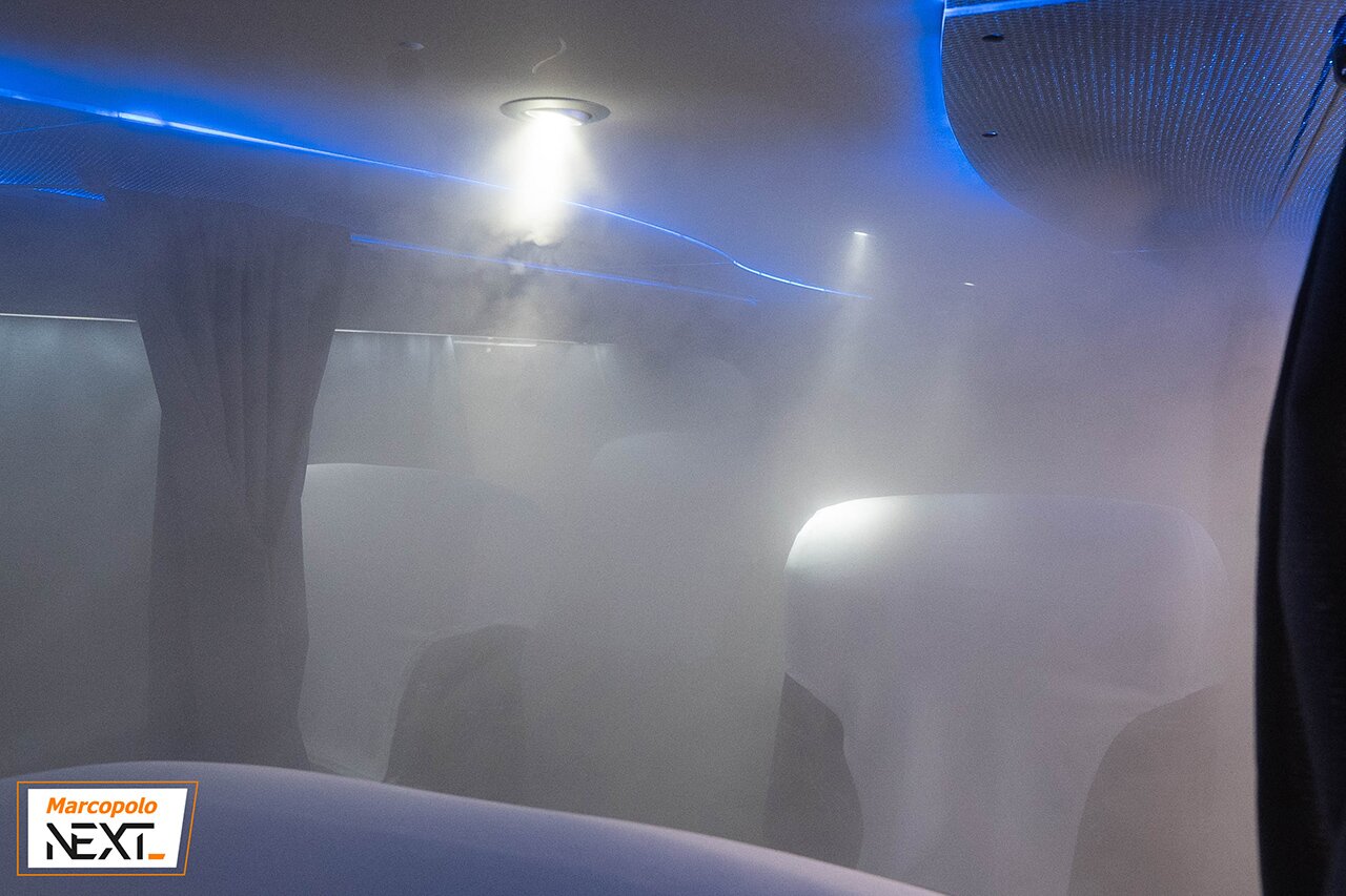 Composto por um conjunto de luminárias ultravioletas que são acionadas automaticamente após a utilização do sanitário, ou em ciclos automáticos durante a utilização do ônibus, o Sistema Sanitário UVC possui eficiência superior a 99,99% na ação antimicrobiana, eliminando vírus, bactérias e outros micro-organismos.